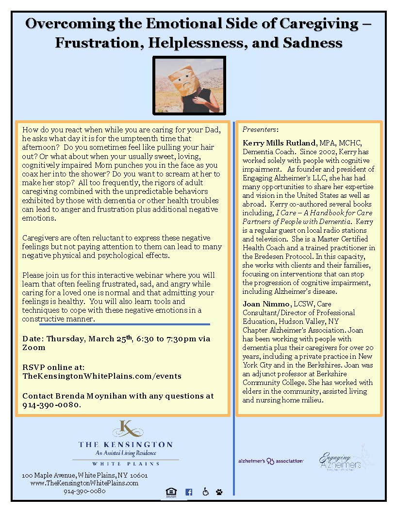 The Kensington is sponsoring a virtual event for caregivers and professionals – Overcoming the Emotional Side of Caregiving: Frustration, Helplessness, and Sadness. During this Zoom presentation, we will delve into the feelings of anger, hopelessness, frustration and more that adult caregivers often feel. We will learn to validate those who have these feelings plus techniques to overcome and cope with these negative emotions in a constructive manner.