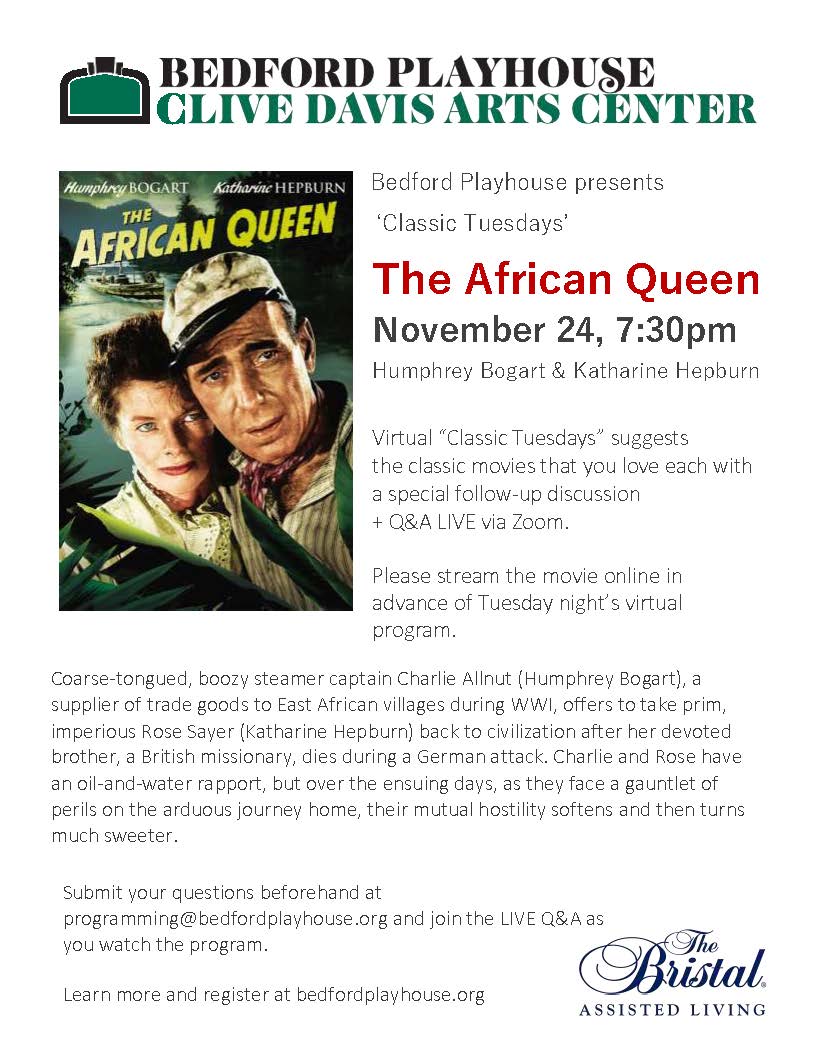 Classic Tuesdays- The African Queen…..Nov 24th at 7:30pm- Special follow-up discussion and Q&A LIVE ZOOM